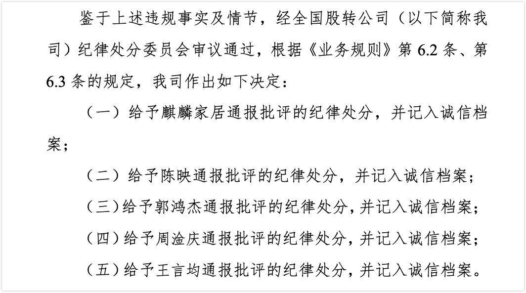 鉴于上述违规事实及情节,股转公司根据《业务规则》相关规定,作出给予麒麟家居、董事长陈映、总经理郭鸿杰、董事会秘书周淦庆、财务负责人王言均通报批评的纪律处分,并计入诚信档案。