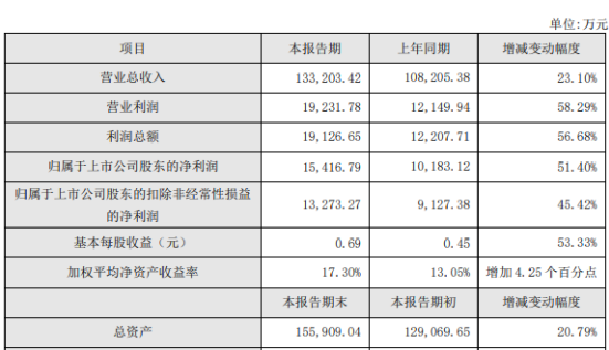 报告期内,公司营业利润同比增长58.29%、利润总额同比增长56.68%、归属于上市公司股东的净利润同比增长51.40%,归属于上市公司股东的扣除非经常性损益的净利润同比增长45.42%、基本每股收益增长53.33%,主要是溧水现代化工业4.0柔性新工厂投入后规模化效应显著,加之其他降本增效的措施致产品毛利率增长,同时报告期内取得的地方经济贡献政策扶持等高于上年同期综合所致。