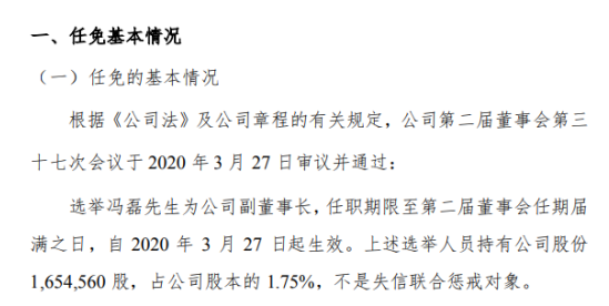 挖贝网 3月28日消息,近日龙泰家居(831445)发公告称董事会于2020年3月27日审议并通过选举冯磊为公司副董事长,任职期限至第二届董事会任期届满之日,自2020年3月27日起生效。