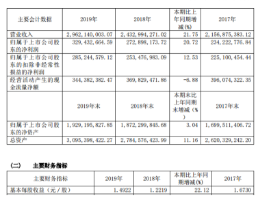 挖贝网 4月16日消息,志邦家居(603801,股吧)(603801)近日发布2019年年度报告,2019年公司营业收入2,962,140,003.07元,同比增长21.75%,实现归属于上市公司股东的净利润329,432,664.59元,同比增长20.72%;实现基本每股收益1.4922元,上年同期为1.2219元。