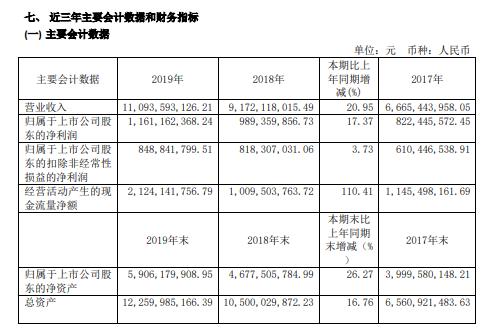 据了解,报告期内,公司面对日益激烈的市场竞争形势,管理层及全体员工的共同努力下,公司进一步发挥了行业龙头优势,坚持打造职业管理体系和组织能力建设,实现了经营业绩的稳步增长。2019年实现营业收入1,109,359.31万元,同比增长20.95%,营业收入首次突破百亿大关;归属于上市公司股东的净利润116,116.24万元,同比增长17.37%。