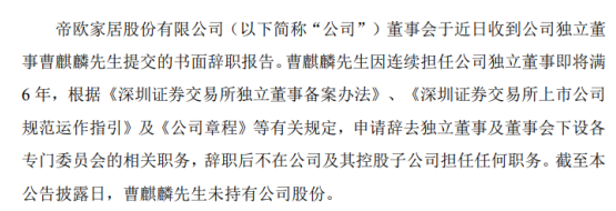 挖贝网 7月9日消息,近日帝欧家居(002798,股吧)(002798)董事会于近日收到公司独立董事曹麒麟提交的书面辞职报告。曹麒麟辞职后不在公司及其控股子公司担任任何职务。