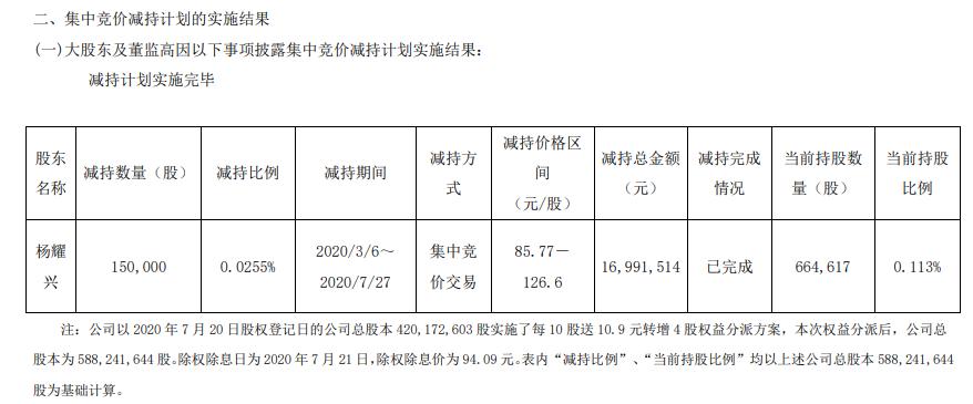 截至本公告日,高级管理人员杨耀兴在上海证券交易所通过集中竞价交易方式完成15万股的减持,权益变动前杨耀兴持股0.146%,权益变动后持股比例为0.113%。
