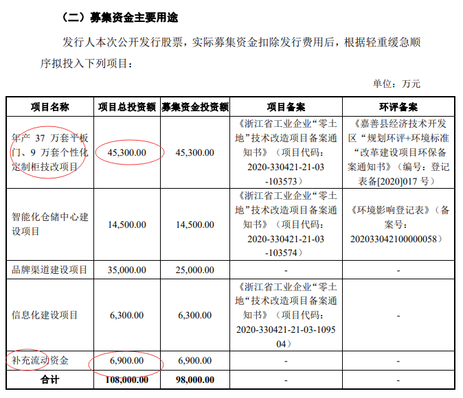 据介绍,梦天家居本次募资总额为10.8亿元,资金主要投入年产37万套平板门、9万套个性化定制柜技改项目、智能化仓储中心建设项目、品牌渠道建设项目、信息化建设项目及补充流动资金。