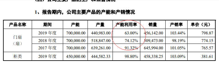 融到资后,扩产能容易找销路难。招股书显示,梦天家居近3年来木门产能利用率一路走低,2017年为91.32%,2018年降为74.12%,去年快速滑落至63%。