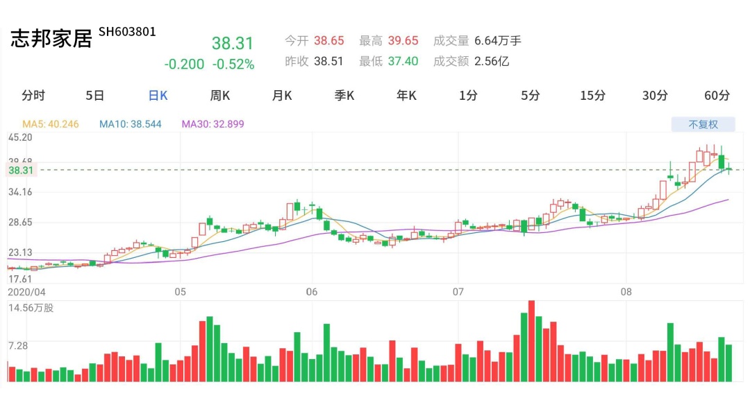 然而,氛围在这周又迎来一个反转。连续两个交易日,板块内许多公司纷纷在高位回调。以志邦家居为例,股价自三天前42.90一路下跌到今日收盘38.31,10%的调整幅度不可谓不大。