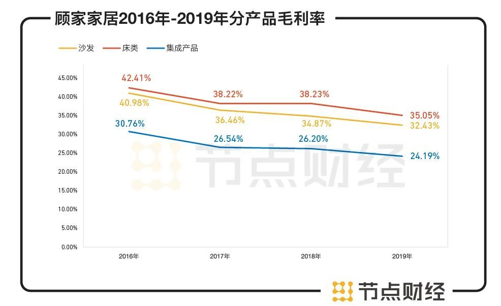 整体来看,虽然沙发依然是顾家家居的“扛鼎”业务,但在床类、集成产品的攻伐下,占比与2016年相比,降低了近10个点,业务状态更加多元化。