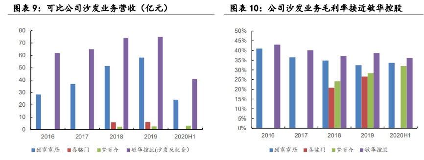 与功能性沙发龙头敏华控股相比,二者沙发业务的营收差距不断缩小。2016年敏华控股沙发业务体量为顾家家居的2.18倍,到2019年收窄至1.29倍。