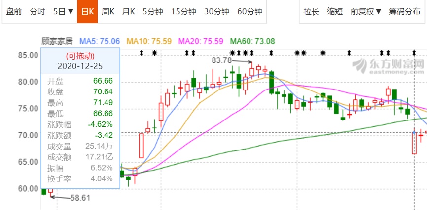 12月25日早盘,顾家家居股价大幅低开,一度逼近跌停,随后反弹,截至当日收盘下跌4.62%,市值相比上一个交易日蒸发超20亿元。