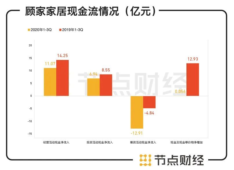 反映在现金流层面,2020年前三季度,顾家家居经营活动产生的现金流净额为11.07亿元,较上年同期减少3.18亿元;筹资活动现金流入19.07亿元,在偿还债务21.6亿元,分配股利、利润、偿付利息7.55亿元后,最终筹资活动现金净流入为-12.91亿元,比上年同期的-4.84亿元大幅扩大。报告期内现金及现金等价物净增加额仅为562.7万,上年同期为12.93亿元。