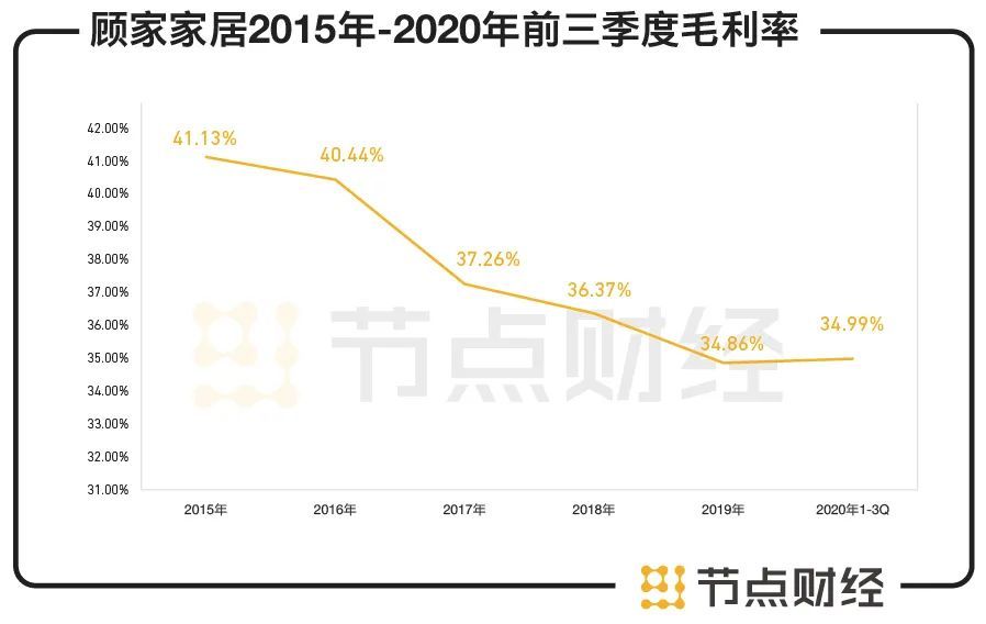 毛利率亦遵循同样的趋势,从2017年37.26%降至2019年34.86%。截至2020年三季度末为34.99%,较上年同期下滑0.09%。
