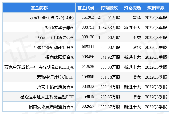 根据2022Q3季报公募基金重仓股数据,重仓该股的公募基金共53家,其中持有数量最多的公募基金为万家行业优选混合(LOF)。万家行业优选混合(LOF)目前规模为101.13亿元,最新净值1.2236(11月2日),较上一交易日上涨1.55%,近一年下跌29.89%。该公募基金现任基金经理为黄兴亮。黄兴亮在任的基金产品包括:万家经济新动能混合A,管理时间为2019年10月30日至今,期间收益率为48.41%;万家科技创新混合A,管理时间为2020年1月7日至今,期间收益率为0.72%;万家自主创新混合A,管理时间为2020年2月10日至今,期间收益率为12.27%。
